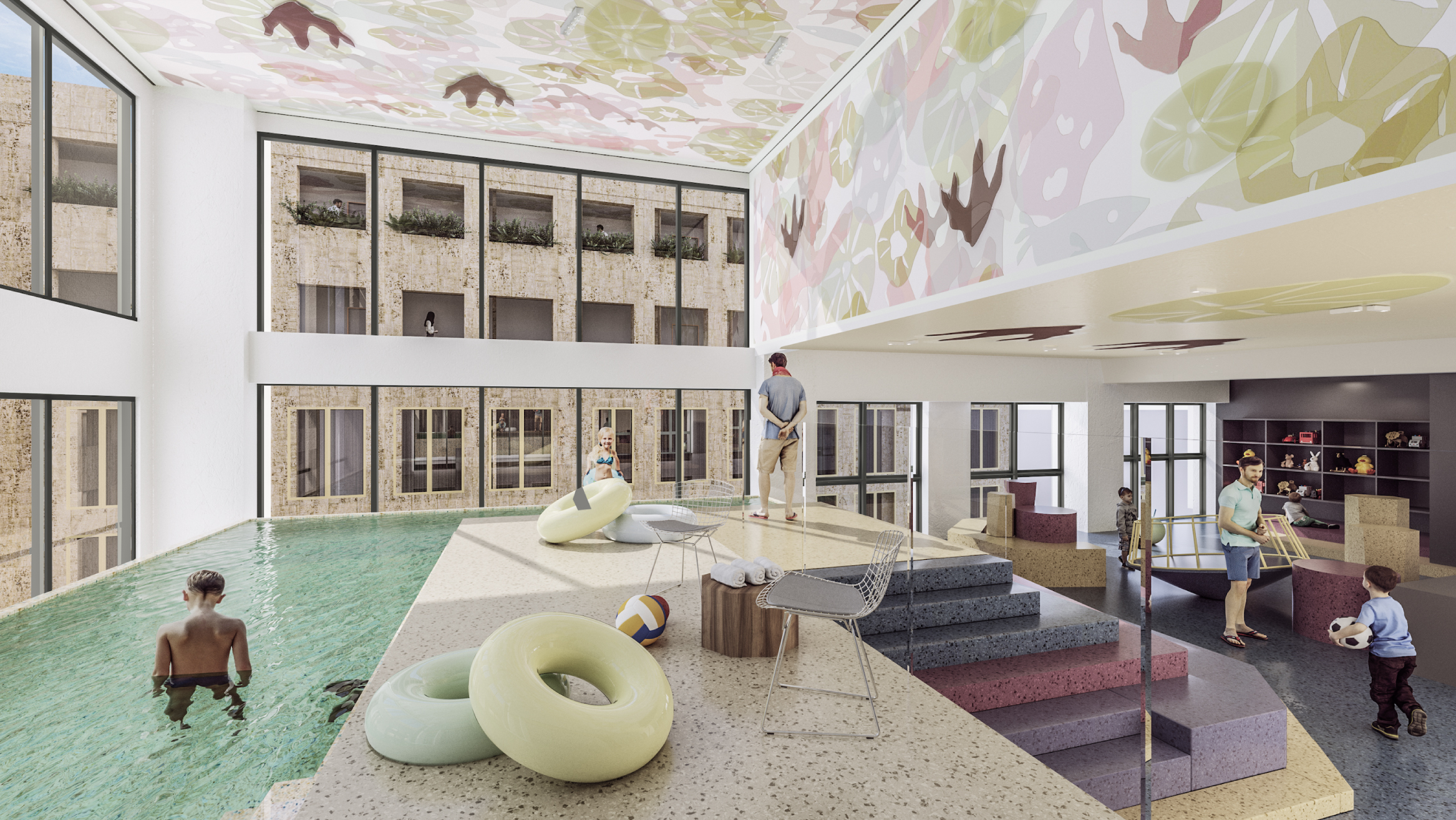 promover la convivencia y el bienestar. La planta baja integra un nivel comercial